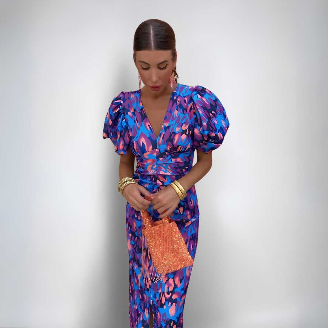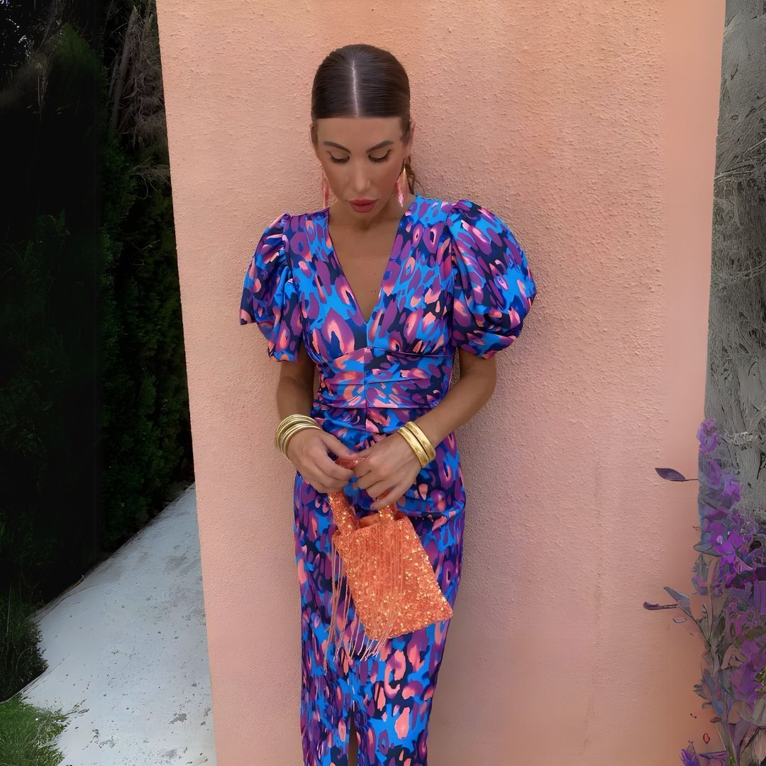🔹Typ : Sukienka midi z kolorowym nadrukiem i bufkami
